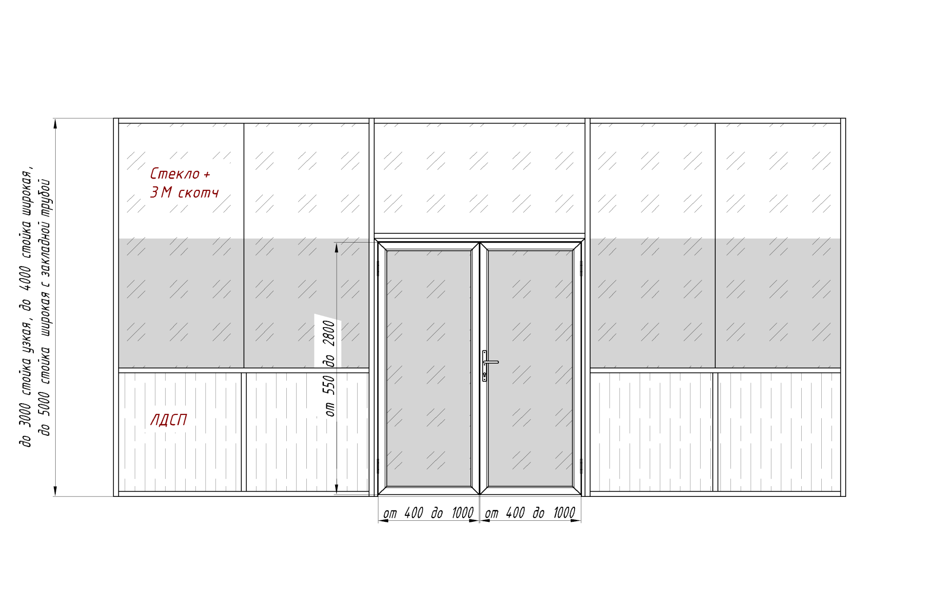 Каркасная перегородка с двустворчатой дверью, одинарное остекление с проклейкой стыков 3М скотчем, с тонировочной пленкой, нижней рассечкой и заполнением ЛДСП трендовая для торгового центра, магазина, аэропорта и вокзала, учебного здания изготавливается из стекла, ЛДСП, применяется для декоративного оформления, для звукоизоляции, для экономии места, для регулирования приватности. Тип товара - каркасная перегородка. Виды оформления - матовые, с химическим травлением.