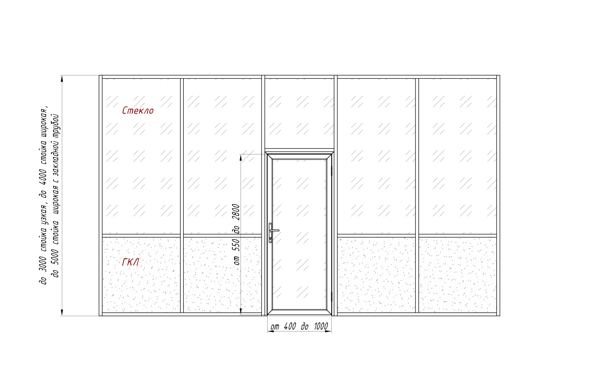 Каркасная перегородка с одностворчатой дверью, двойное остекление с нижней рассечкой и заполнением ГКЛ доступная для кафе и ресторана, гостиницы, медицинского учреждения, бизнес-центра производится из стекла, алюминия, стали, подходит для зонирования, для организации рабочего места, для звукоизоляции, для престижных интерьеров.Конструкция - каркасная перегородка. Варианты оформления - матовые, осветленные OptiWhite, с пескоструйной обработкой.