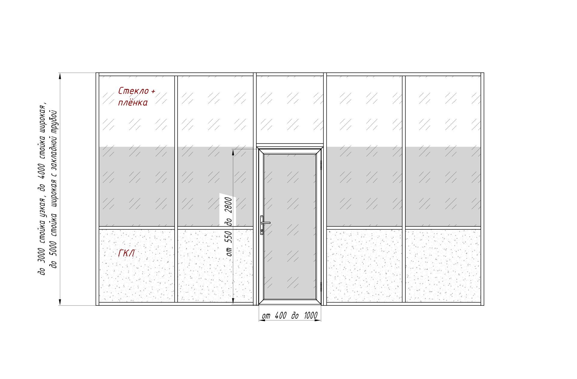 Каркасная перегородка с одностворчатой дверью, двойное остекление с тонировочной пленкой по центру, с нижней рассечкой и заполнением ГКЛ премиум-класса для кафе и ресторана, гостиницы, бизнес-центра, учебного здания изготавливается из двойного стекла, алюминия, используется для зонирования, для организации рабочего места, для регулирования приватности, для престижных интерьеров.Тип товара - каркасная перегородка. Доступное оформление - прозрачные, с декоративной пленкой.
