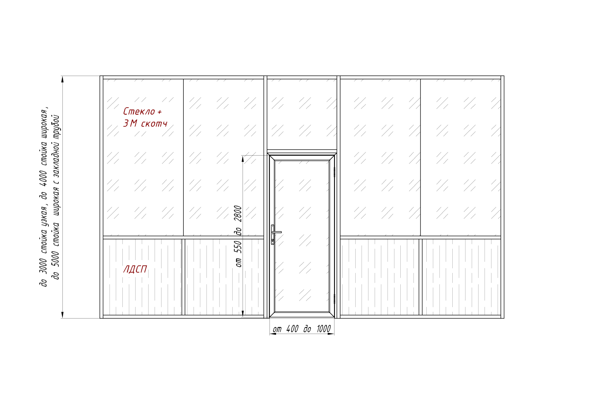 Каркасная перегородка с одностворчатой дверью, одинарное остекление с проклейкой стыков 3М скотчем, нижней рассечкой и заполнением ЛДСП хит продаж для медицинского учреждения, бизнес-центра, аэропорта и вокзала, учебного здания изготавливается из стекла, ЛДСП, используется для зонирования, для звукоизоляции, для организации пространства, для визуального простора. Тип товара - каркасная перегородка. Доступны варианты оформления - матовые, с химическим травлением.