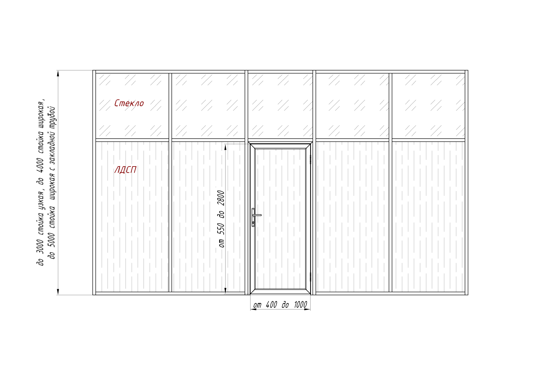 Каркасная перегородка с одностворчатой дверью, остекление с частичным заполнением ДДСП хит продаж для бутика, кафе и ресторана, банка, салона красоты производится из стекла, алюминия, используется для звукоизоляции, для организации пространства, для престижных интерьеров, для визуального простора. Тип товара - каркасная перегородка. Оформление - матовые, осветленные OptiWhite, с пескоструйной обработкой.