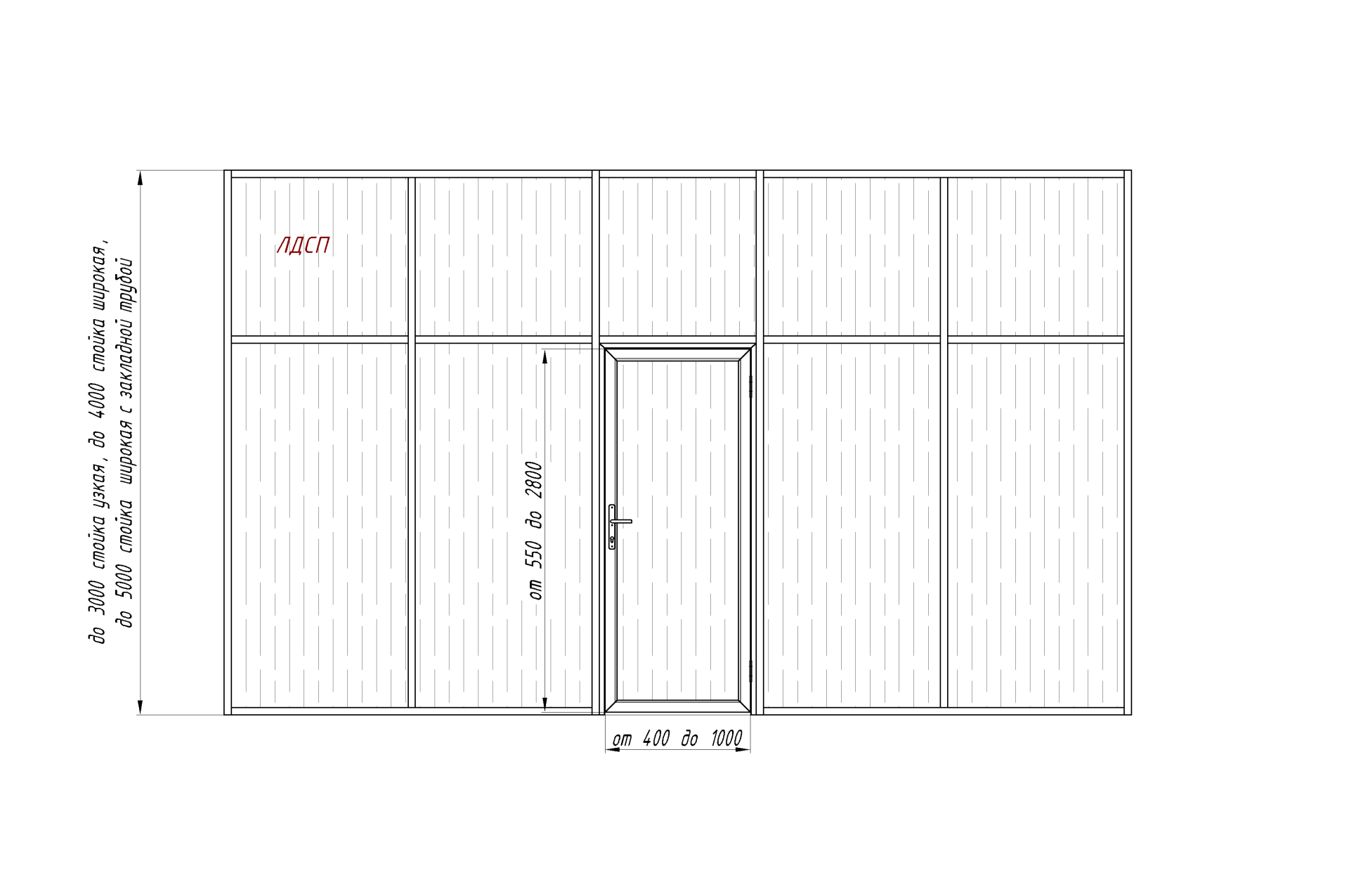 Каркасная перегородка с одностворчатой дверью, с полным заполнением ЛДСП популярная для кафе и ресторана, гостиницы, аэропорта и вокзала, учебного здания производится из стекла, ЛДСП, стали, используется для организации пространства, для престижных интерьеров, для общественных помещений, для визуального простора. Тип товара - каркасная перегородка. Варианты оформления - матовые, с химическим травлением.