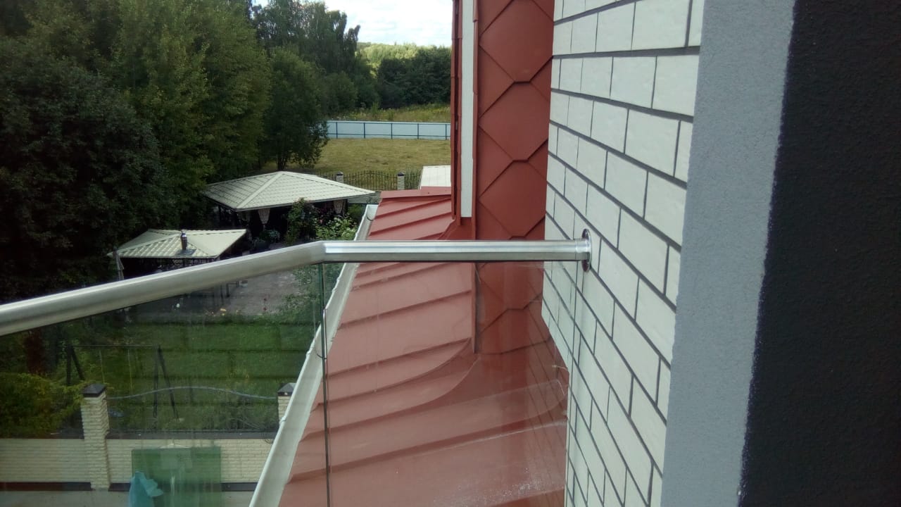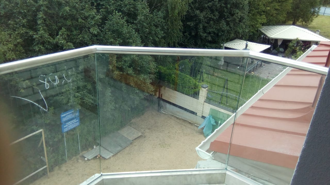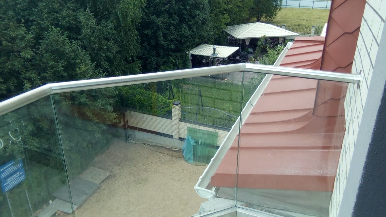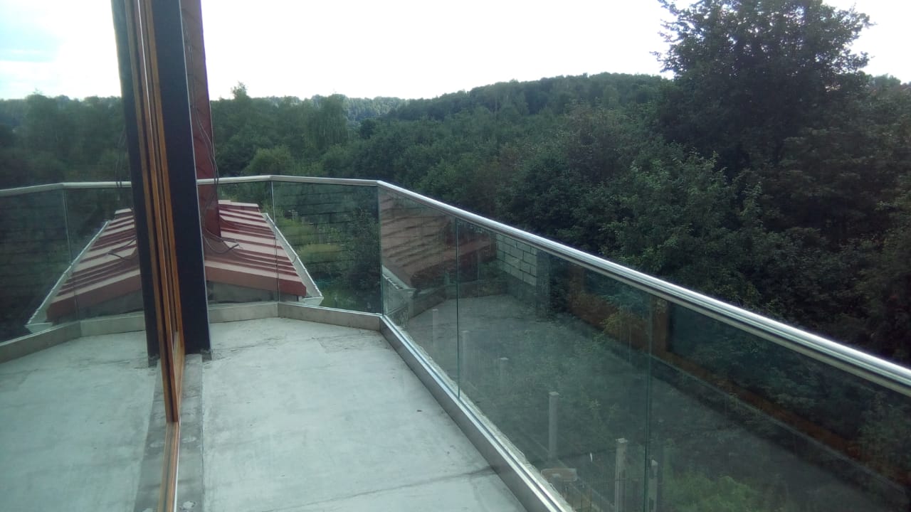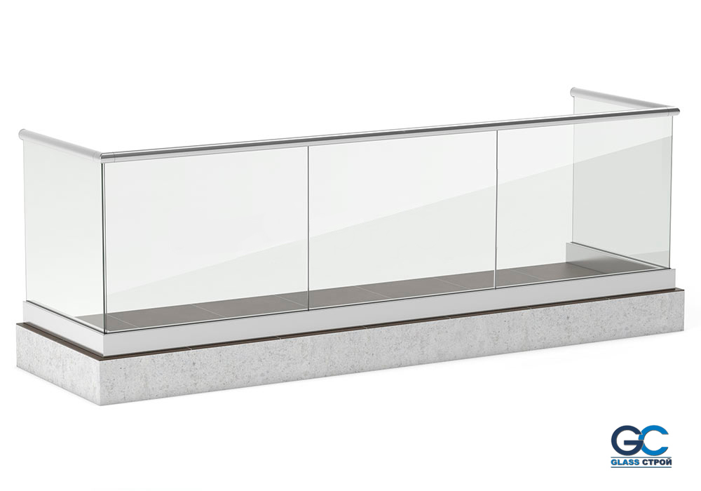 Цельностеклянное ограждение балкона триплекс на нижнем зажимном профиле 100мм с поручнем стандартная для квартиры, гостиницы, медицинского учреждения изготавливается из стекла, цельного стекла, стали, используется для жилых помещений, для декоративного оформления, для престижных интерьеров. Тип товара - ограждение. Возможные варианты оформления - матовые.