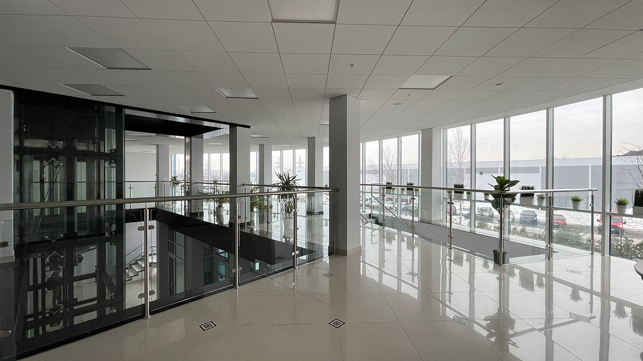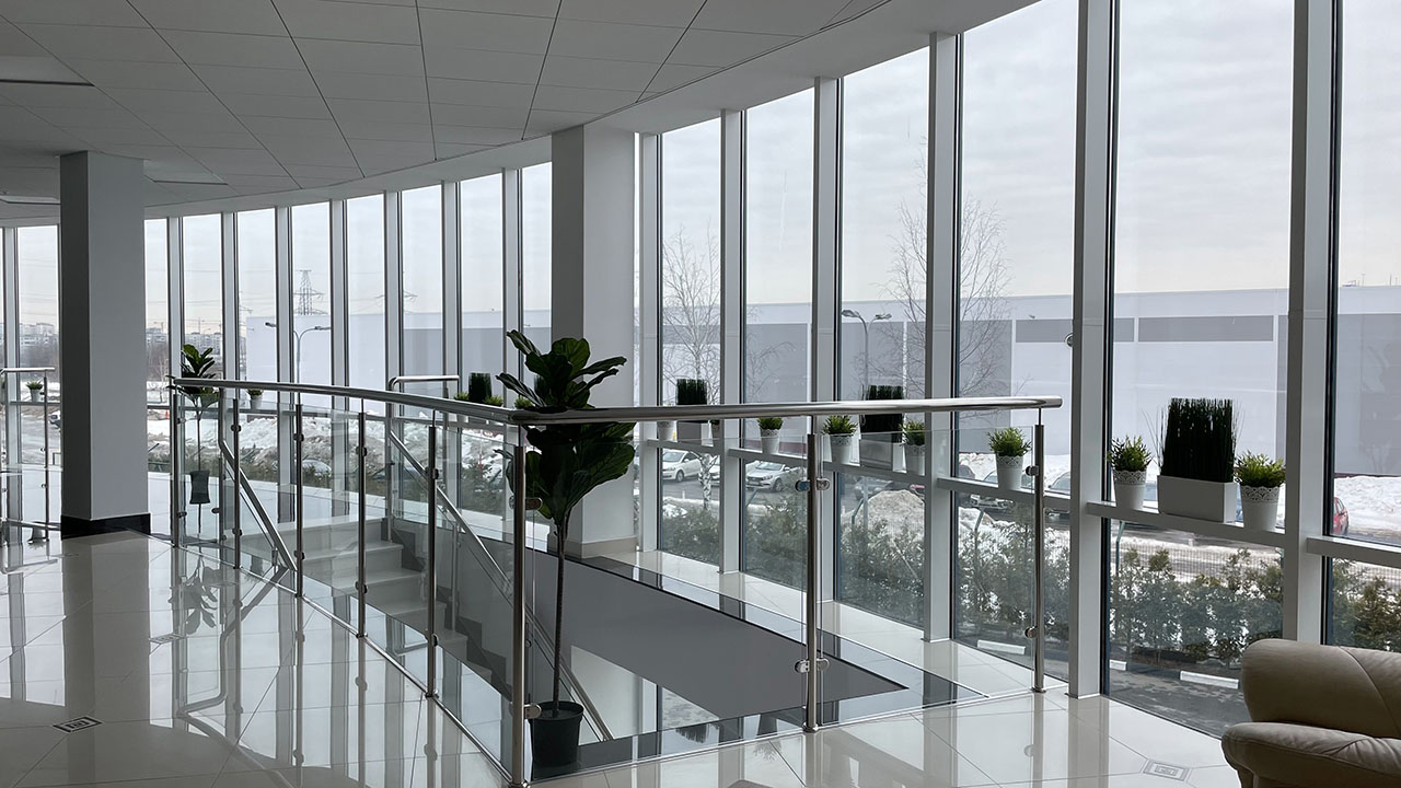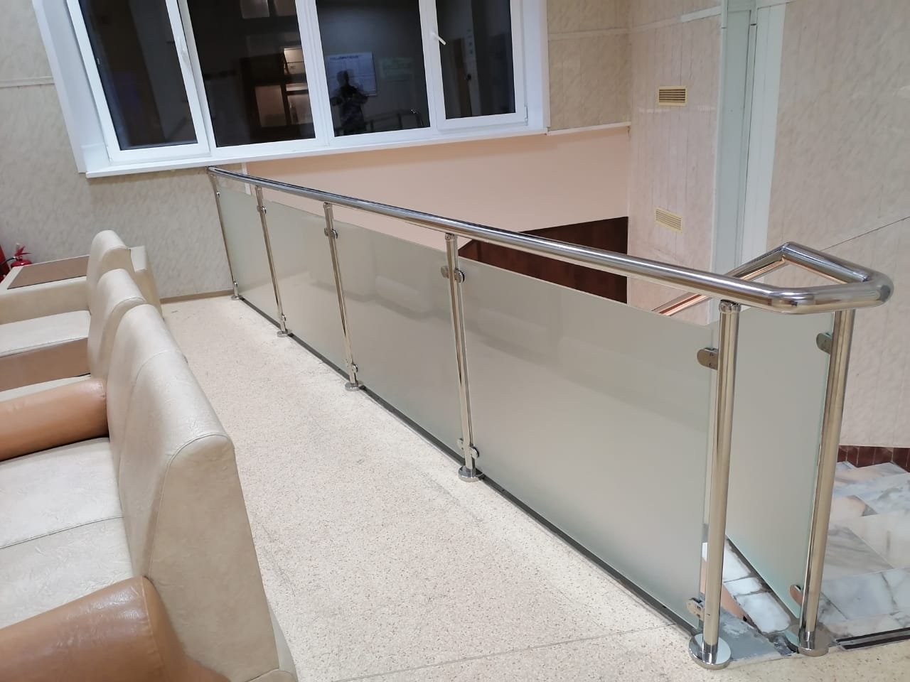 Ограждения цельностеклянные триплекс на круглых стойках из нержавеющей стали хит продаж для гостиницы, медицинского учреждения, бизнес-центра, аэропорта и вокзала производится из двойного стекла, закаленного стекла, алюминия, применяется для престижных интерьеров, для общественных помещений, для помещений с большой проходимостью. Тип конструкции - ограждение. Доступны варианты оформления - матовые, осветленные OptiWhite.