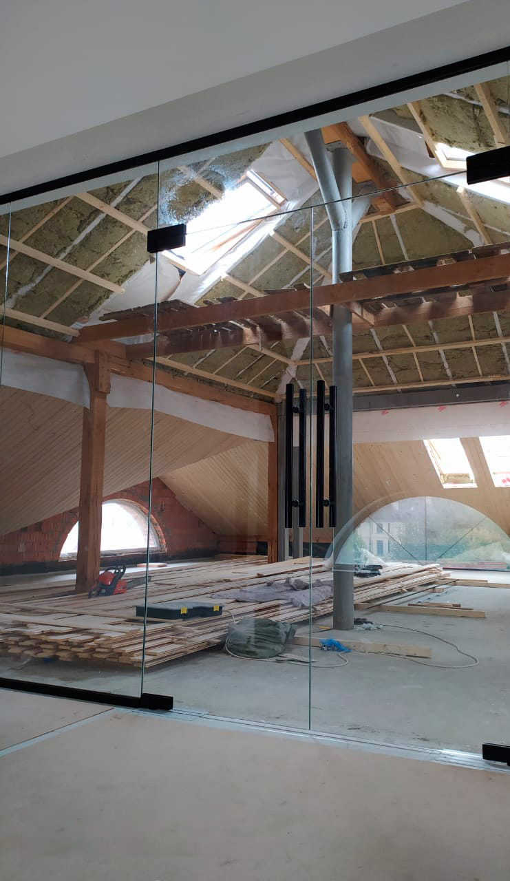 Две двери, перегородка, большая фрамуга для зонирования стандартная для бутика, кафе и ресторана, гостиницы производится из стекла, двойного стекла, закаленного стекла, подходит для зонирования, для организации рабочего места, для декоративного оформления, для визуального простора. Конструкция - перегородка. Возможные варианты оформления - матовые, осветленные OptiWhite, с пескоструйной обработкой.