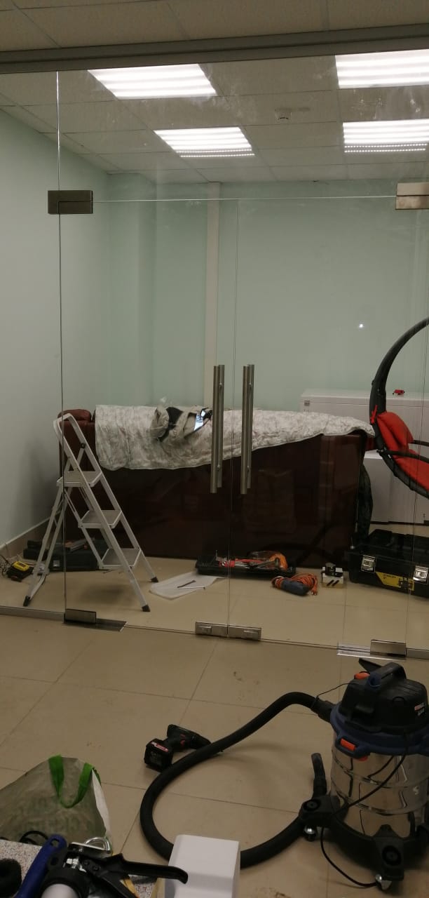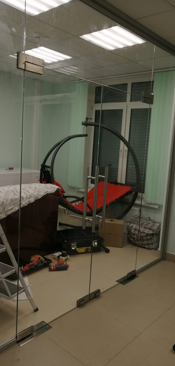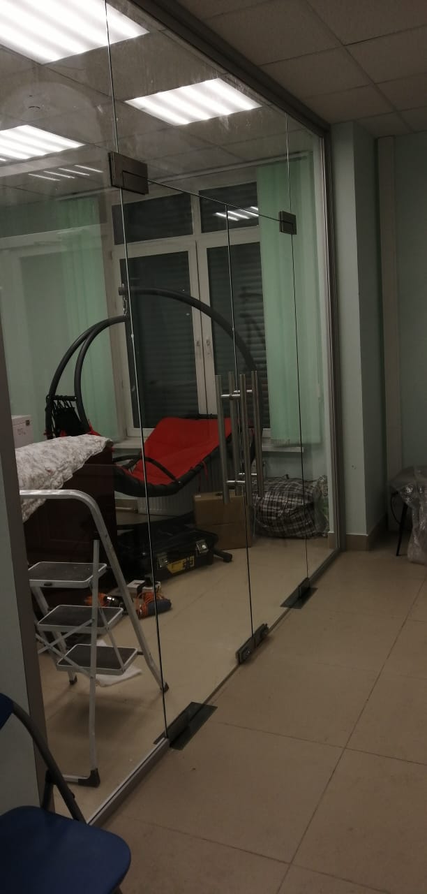 Две одностворчатые двери с малой фрамугой и две перегородкой из триплекса по краям стандартная для квартиры, бутика, магазина, кафе и ресторана изготавливается из стекла, цельного стекла, двойного стекла, подходит для организации рабочего места, для декоративного оформления, для престижных интерьеров, для визуального простора. Конструкция - перегородка. Возможные варианты оформления - прозрачные, с декоративной пленкой, с химическим травлением.
