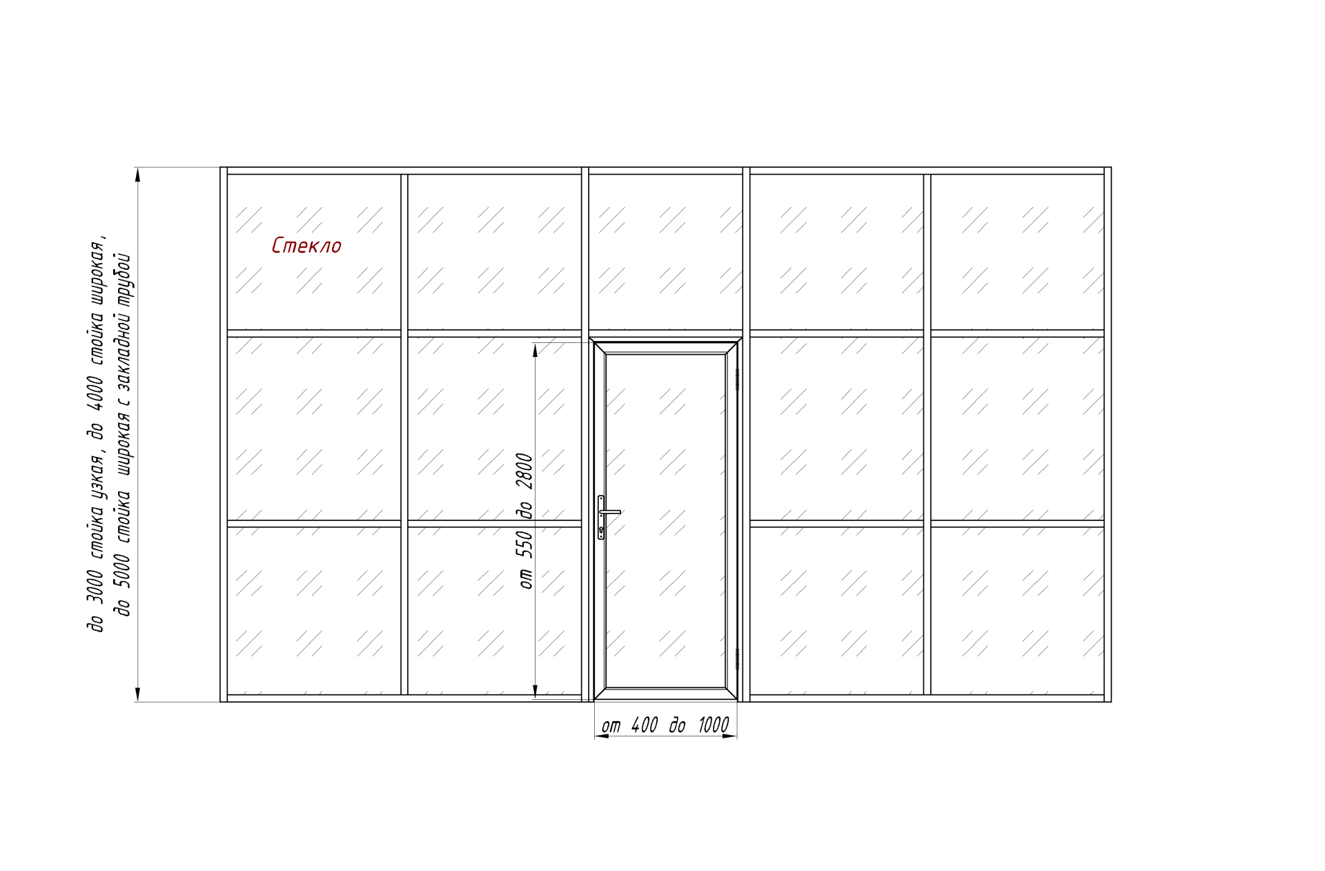 Каркасная офисная перегородка с одностворчатой дверью, двойное остекление с верхней и нижней рассечкой недорогая для помещения, офиса, дома производится из двойного стекла, алюминия, используется для организации рабочего места, для регулирования приватности, для организации пространства, для престижных интерьеров. Тип товара - перегородка. Варианты оформления - матовые, осветленные OptiWhite, с пескоструйной обработкой.