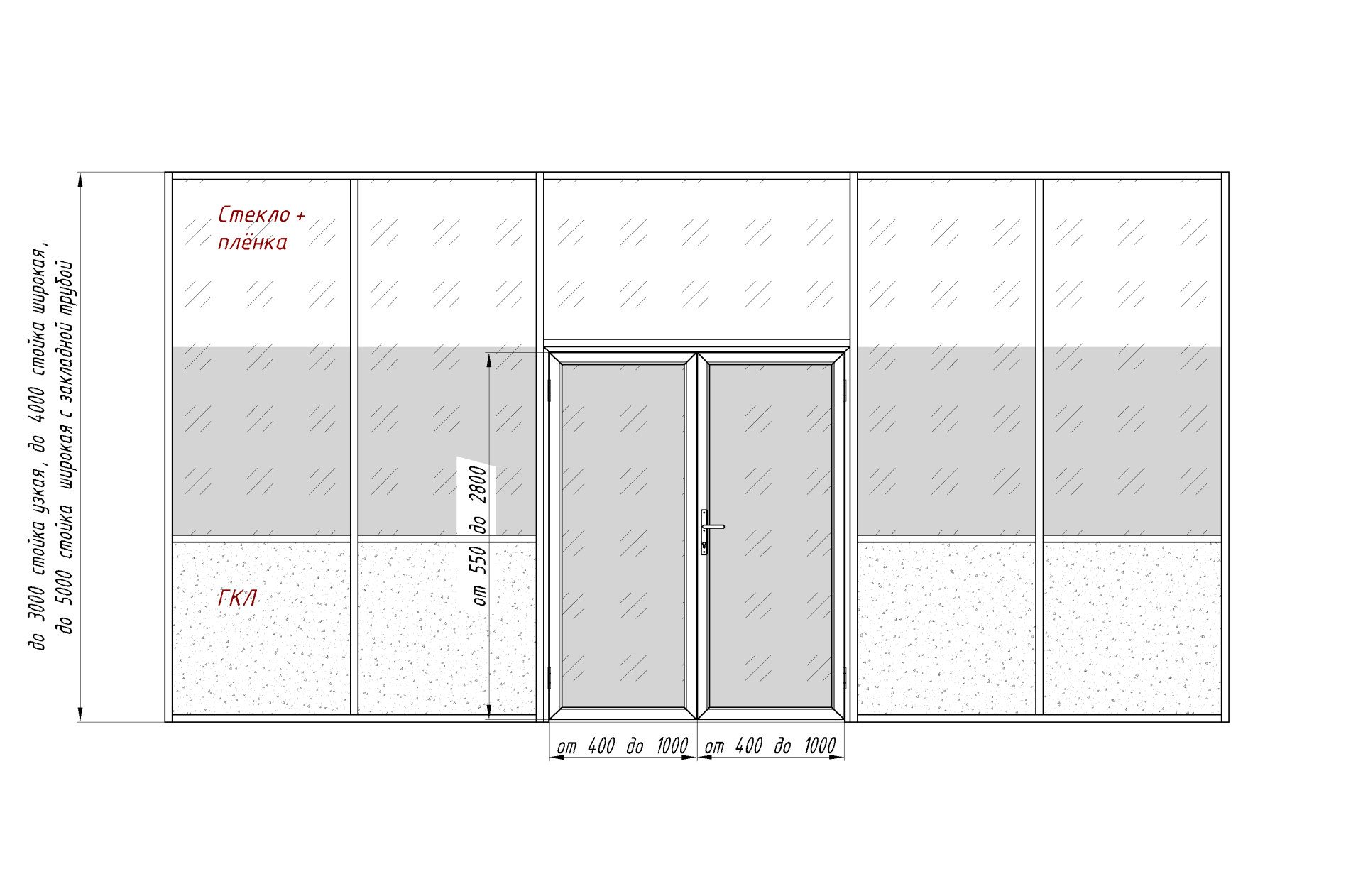 Каркасная перегородка с двустворчатой дверью, одинарное остекление с тонировочной пленкой, нижней рассечкой и заполнением ГКЛ бизнес-класса для квартиры, кафе и ресторана, гостиницы, медицинского учреждения изготавливается из стекла, алюминия, используется для зонирования, для организации рабочего места, для регулирования приватности, для визуального простора.Тип конструкции - перегородка. Доступное оформление - прозрачные, с химическим травлением.