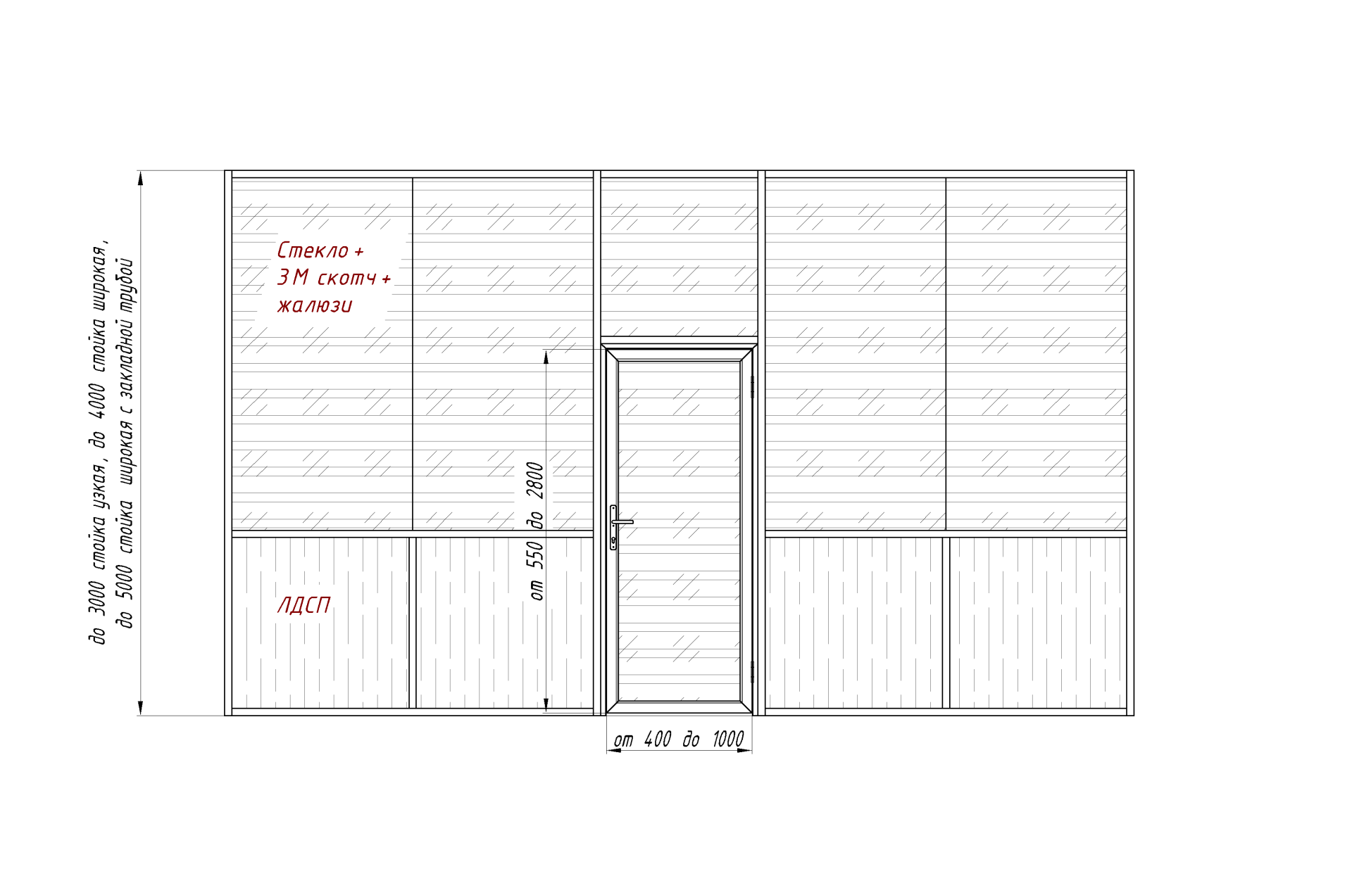 Каркасная перегородка с одностворчатой дверью, двойное остекление с проклейкой стыков 3М скотчем, с межрамными жалюзи и нижней рассечкой и заполнением ЛДСП бюджетная для офиса, бутика, магазина, гостиницы изготавливается из стекла, ЛДСП, используется для звукоизоляции, для регулирования приватности, для организации пространства, для визуального простора. Тип товара - перегородка. Доступное оформление - матовые, с химическим травлением.