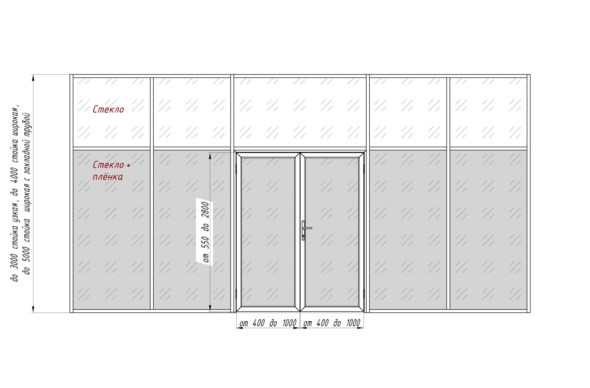Каркасная перегородка с одностворчатой дверью, двойное остекление, с верхней рассечкой и тонировочной пленкой доступная для помещения, офиса, дома, квартиры производится из стекла, алюминия, используется для регулирования приватности, для организации пространства, для общественных помещений, для визуального простора. Тип товара - перегородка. Доступное оформление - прозрачные, с химическим травлением.