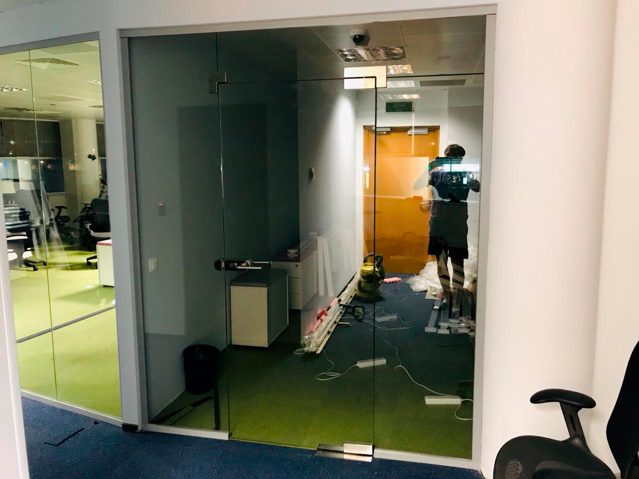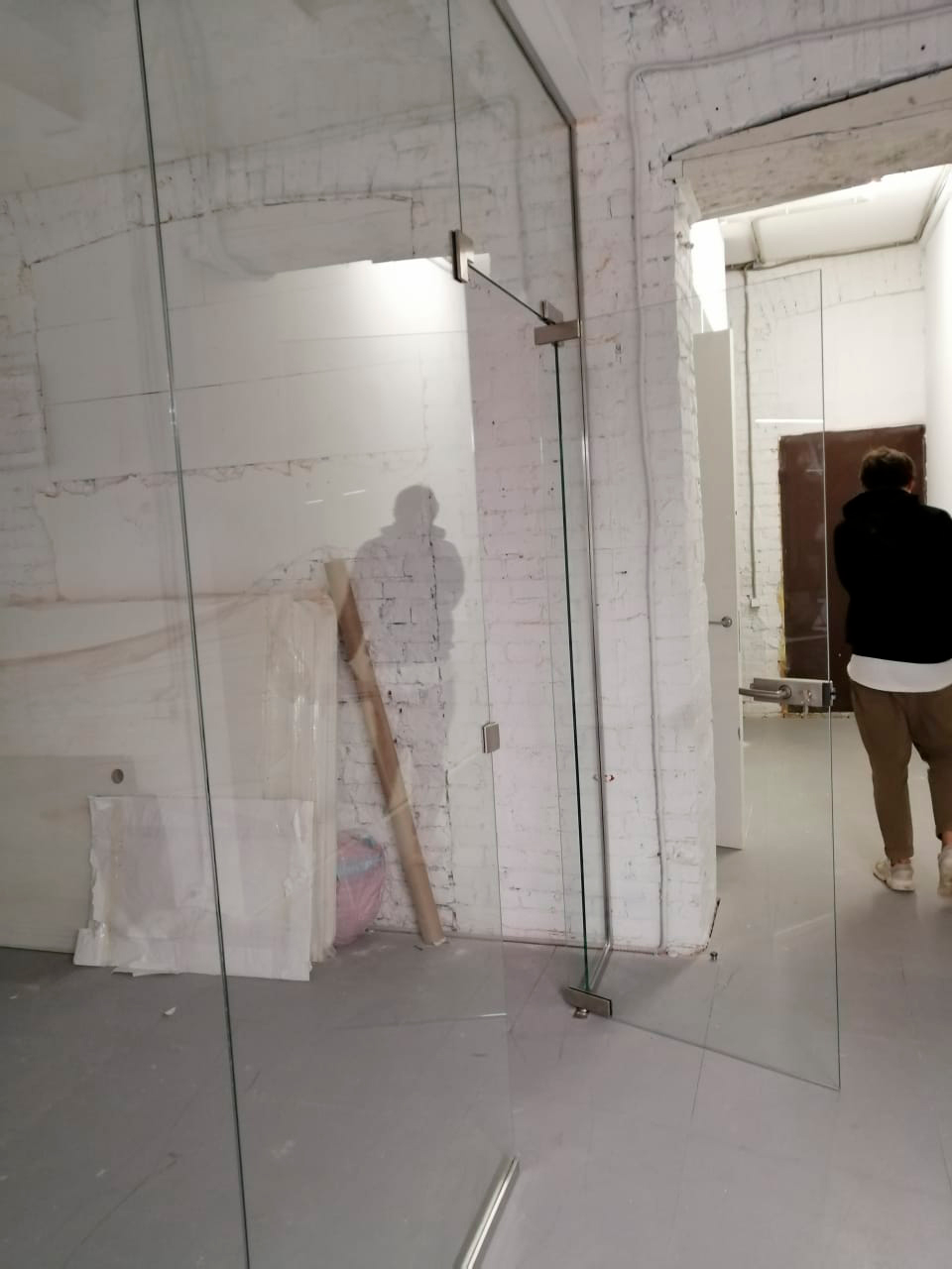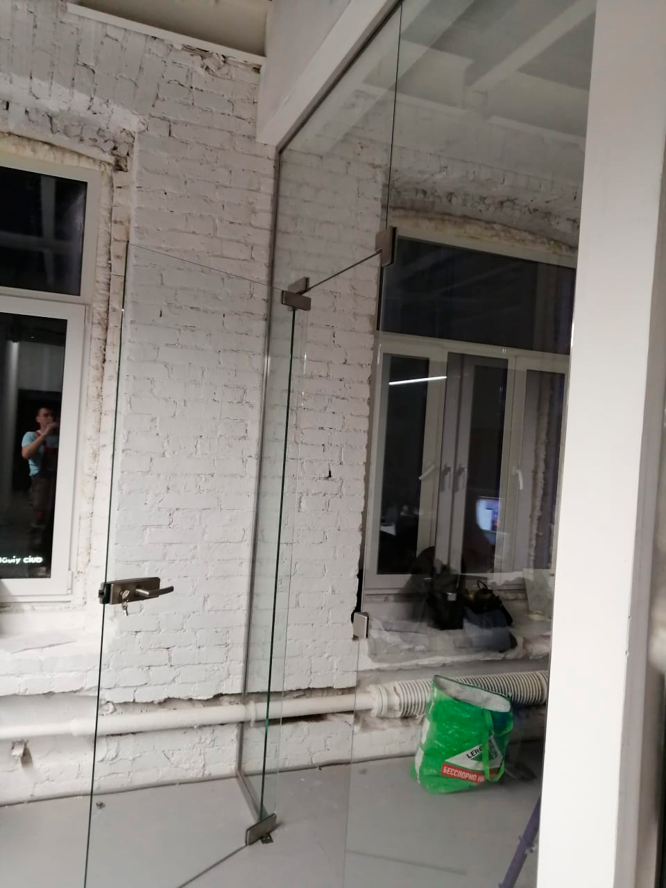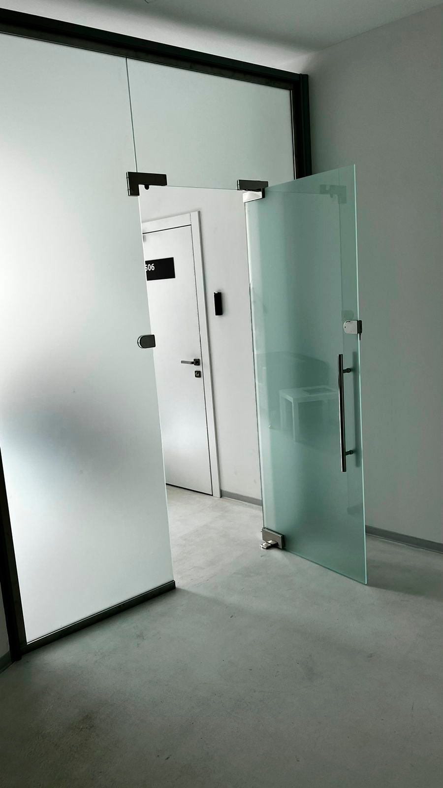 Одна дверь, две перегородки, средняя фрамуга премиум-класса для квартиры, гостиной, бутика производится из стекла, двойного стекла, закаленного стекла, подходит для зонирования, для звукоизоляции, для престижных интерьеров. Тип товара - перегородка. Тип оформления - матовые, с пескоструйной обработкой.