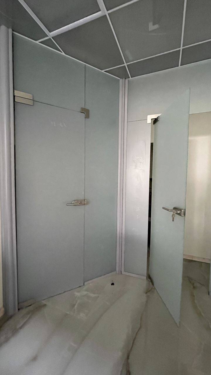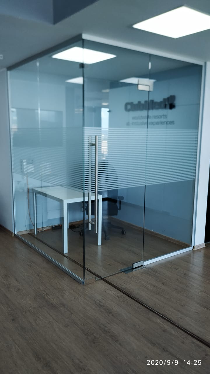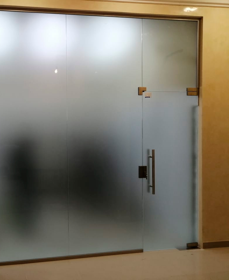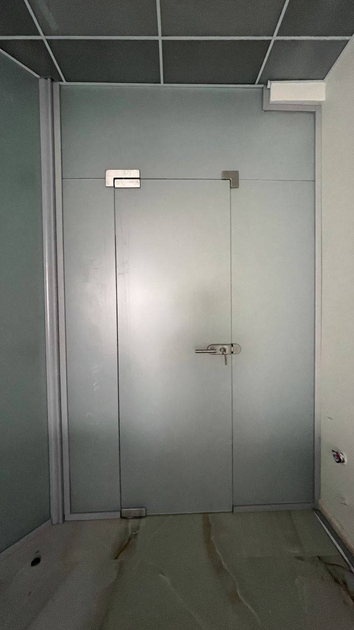 Одностворчатая матовая дверь от 10мм с фрамугой и перегородка стандартная для гостиной, бутика, салона красоты производится из стекла, двойного стекла, подходит для регулирования приватности, для организации пространства, для помещений с повышенной влажностью. Тип товара - перегородка. Доступное оформление - матовые, с пескоструйной обработкой.