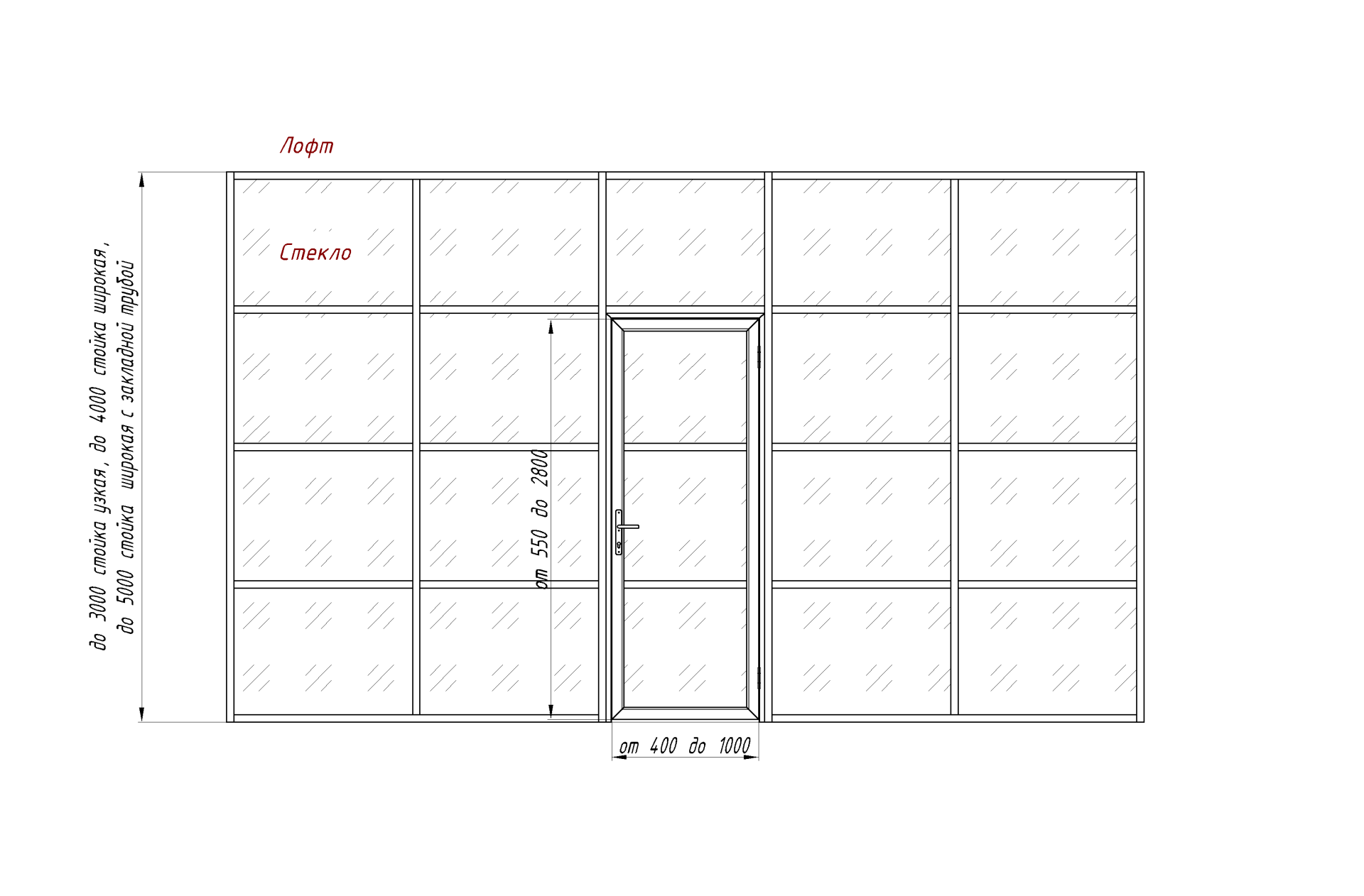 Каркасная стена с одностворчатой дверью, двойное остекление с многократной рассечкой бюджетная для помещения, офиса, дома, квартиры производится из стекла, алюминия, стали, используется для утепления, для организации рабочего места, для декоративного оформления, для звукоизоляции. Конструкция - стена. Возможные варианты оформления - матовые, осветленные OptiWhite, с химическим травлением.