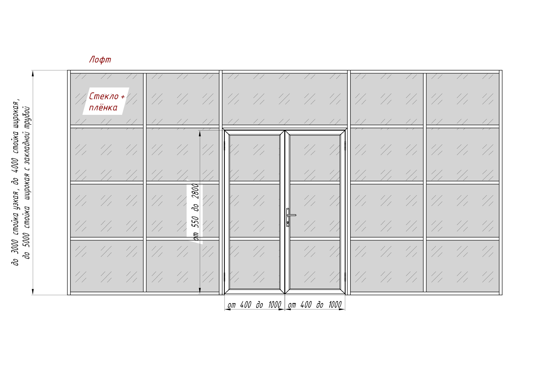 Входная группа с двустворчатой дверью, одинарное остекление с тонировочной пленкой и многократной рассечкой хит продаж для магазина, кафе и ресторана, гостиницы, медицинского учреждения производится из стекла, алюминия, стали, используется для организации рабочего места, для звукоизоляции, для престижных интерьеров, для общественных помещений. Тип товара - входная группа. Доступное оформление - матовые, осветленные OptiWhite, с химическим травлением.