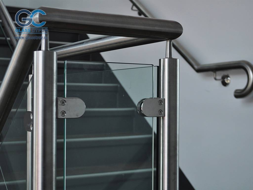 | Стекло. | Такие поручни изготавливаются в монолитной форме, объединяющей функции перил и стоек. В качестве полотен используется закалённое стекло или триплекс толщиной от 8 мм. При этом рекомендованная длина полотен составляет 0,9 – 1,5 м. | Конструкции используются в интерьерах торговых и коммерческих помещений. |