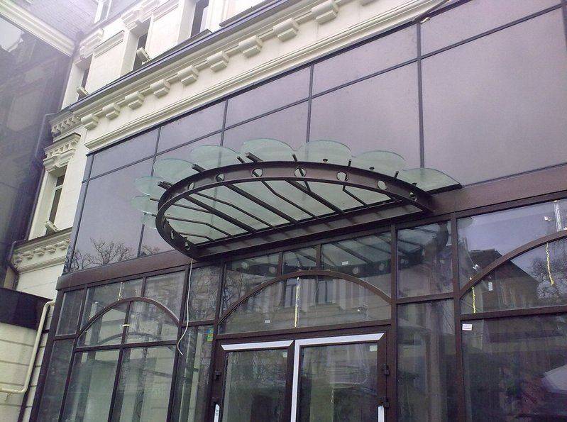 Выбор оформления стекла зависит от идеи. Это может быть окрашенное стекло, затемнённое (тонированное), которое выполняет роль защиты от солнечных лучей, и матовое. Возможность его окраски позволяет дизайнерам экспериментировать с оформлением фасадов, сочетая разные стили. Например, козырёк со стеклом бронзового оттенка и такого же цвета фурнитурой создаст особое эклектическое настроение, в котором будет улавливаться стык античной истории и космической фантасмагории.