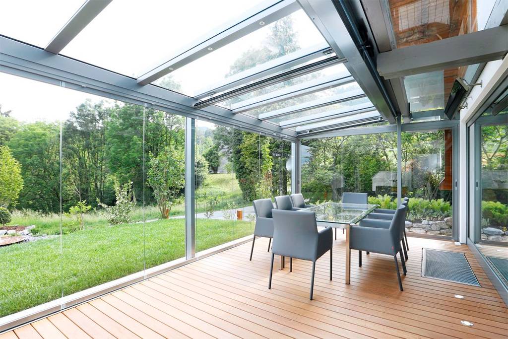 Зимний сад, террасу и даже веранду можно оборудовать прозрачной крышей. Для дверных систем используются те же самые материалы, что и для стен. Распространены следующие конструкции дверей: