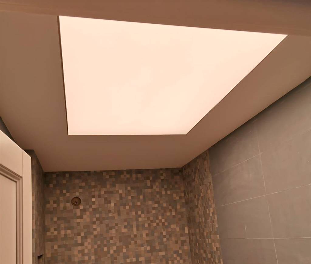 - Стеклянный потолок на подвесной конструкции позволяет скрыть недостатки помещения, в том числе неровности поверхности, провода, трубы.