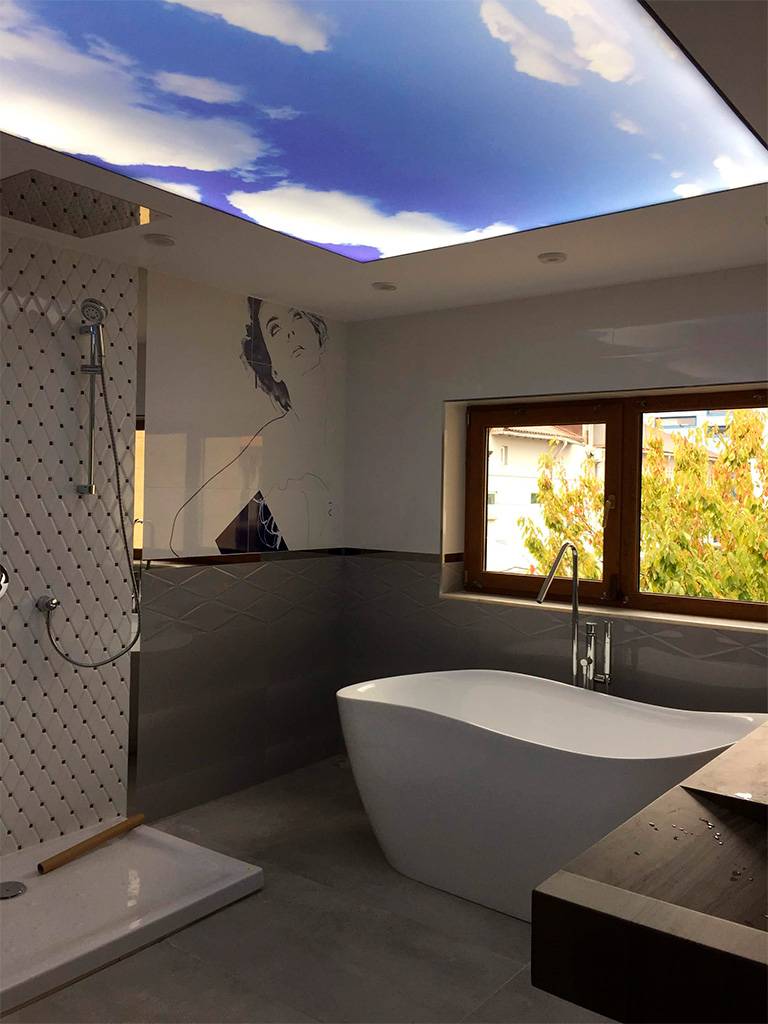 Стеклянные навесные потолочные конструкции позволяют визуально расширить пространство небольших помещений. Потолки из стекла с оригинальным рисунком или фотопечатью могут стать стильной изюминкой интерьера в гостиных комнатах и холлах частных домов и коттеджей. В квартире-студии зеркальный потолок часто используется для разделения свободной площади на отдельные зоны - для приготовления еды, отдыха и обеденную часть.
